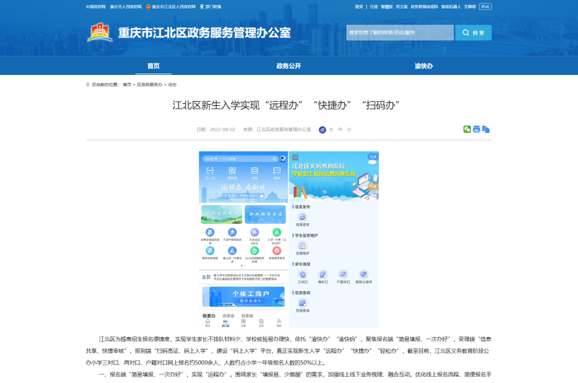 江北区义务教育阶段学校招生实现“一件事一次办”